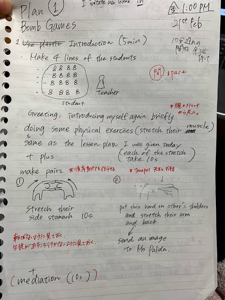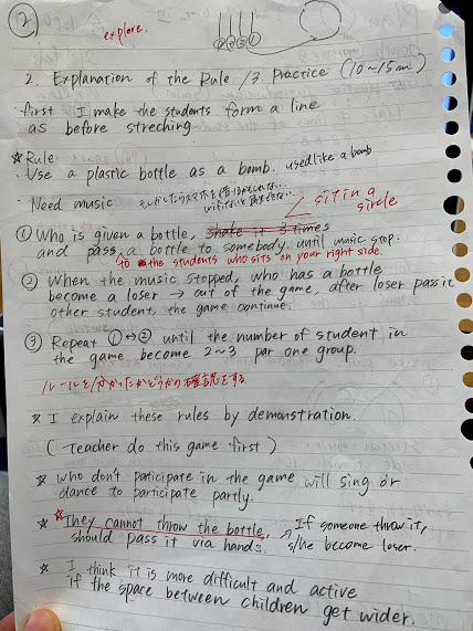 When I made a lesson plan, I took the lesson plan that cadet teacher made into account. The class consists of the “objective” “which student will be taught” “introduction including the warming up” “rule explanation” “practice” “result after the practice” “summary”. The following photographs are the lesson plans that I wrote.